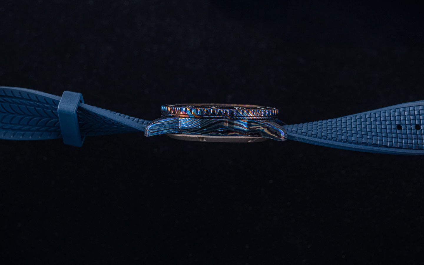 The case, crown, bezel and case back are made of the premium material called timascus, which is a forge mix of different titanium grades and zirconium. After the material is cut with CNC machine, all parts are heated in the oven to let the texture come out of the metal and appear in silver, blue, orange tones. The dimensions are diameter with crown 42.80 mm, without crown 39.00 mm. Lug to Lug is 47 mm.