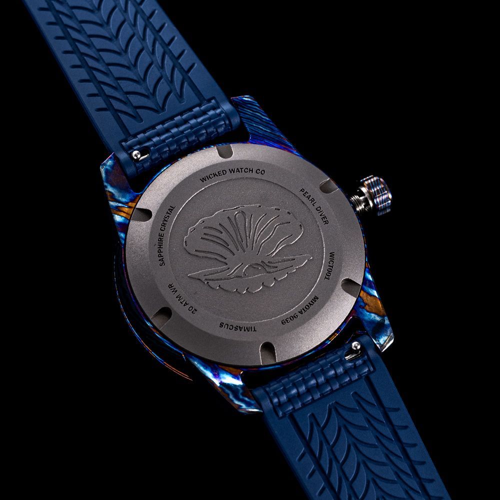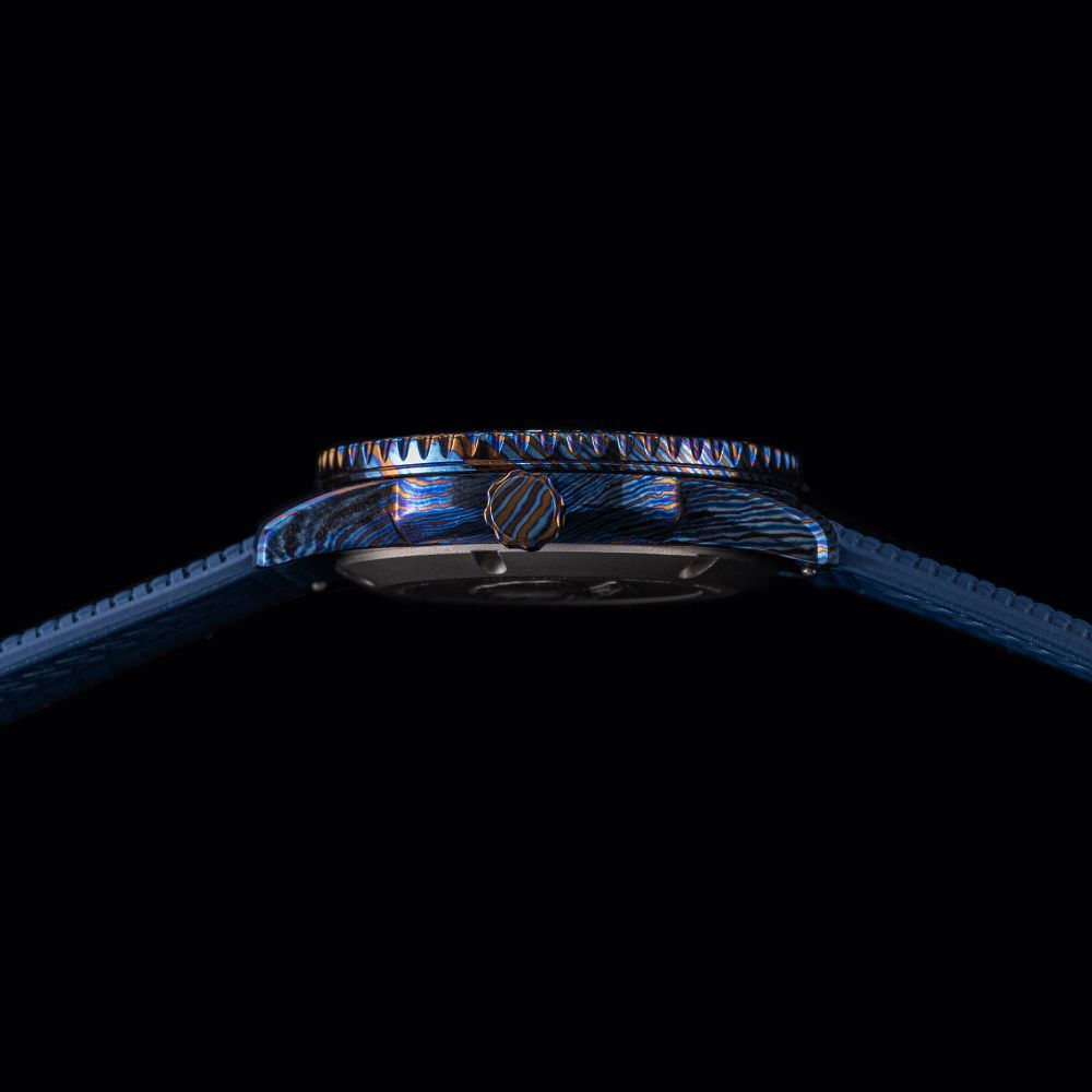 The watch case is crafted from Timascus, a remarkable material made from a striking fusion of various titanium alloys. This gives each watch a unique, iridescent appearance.