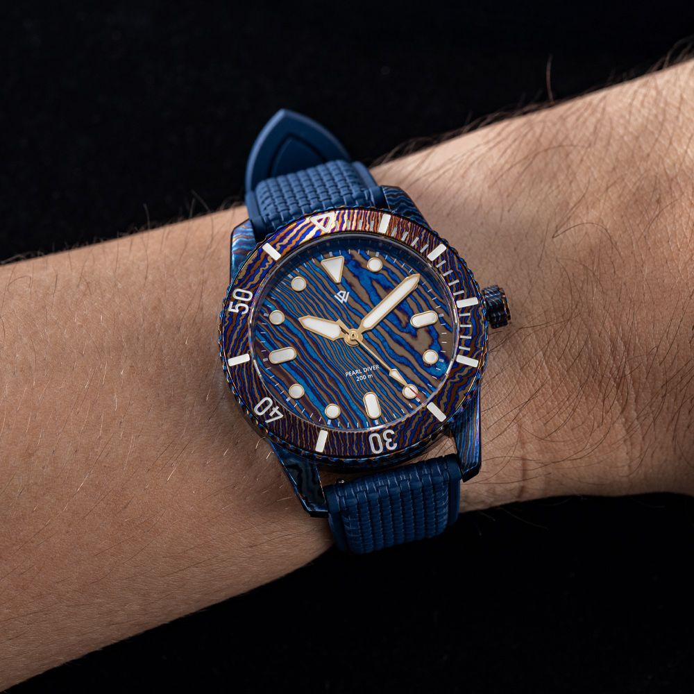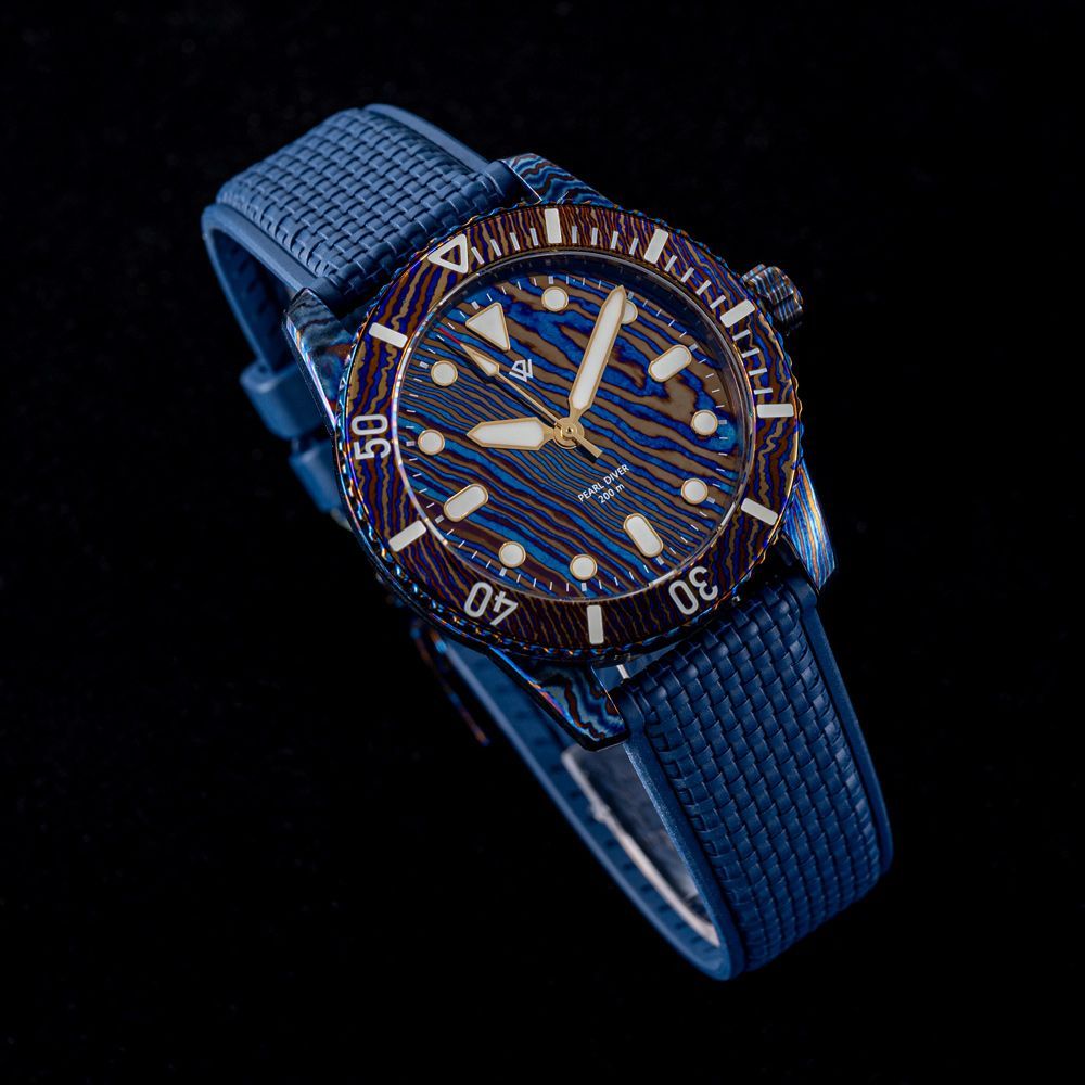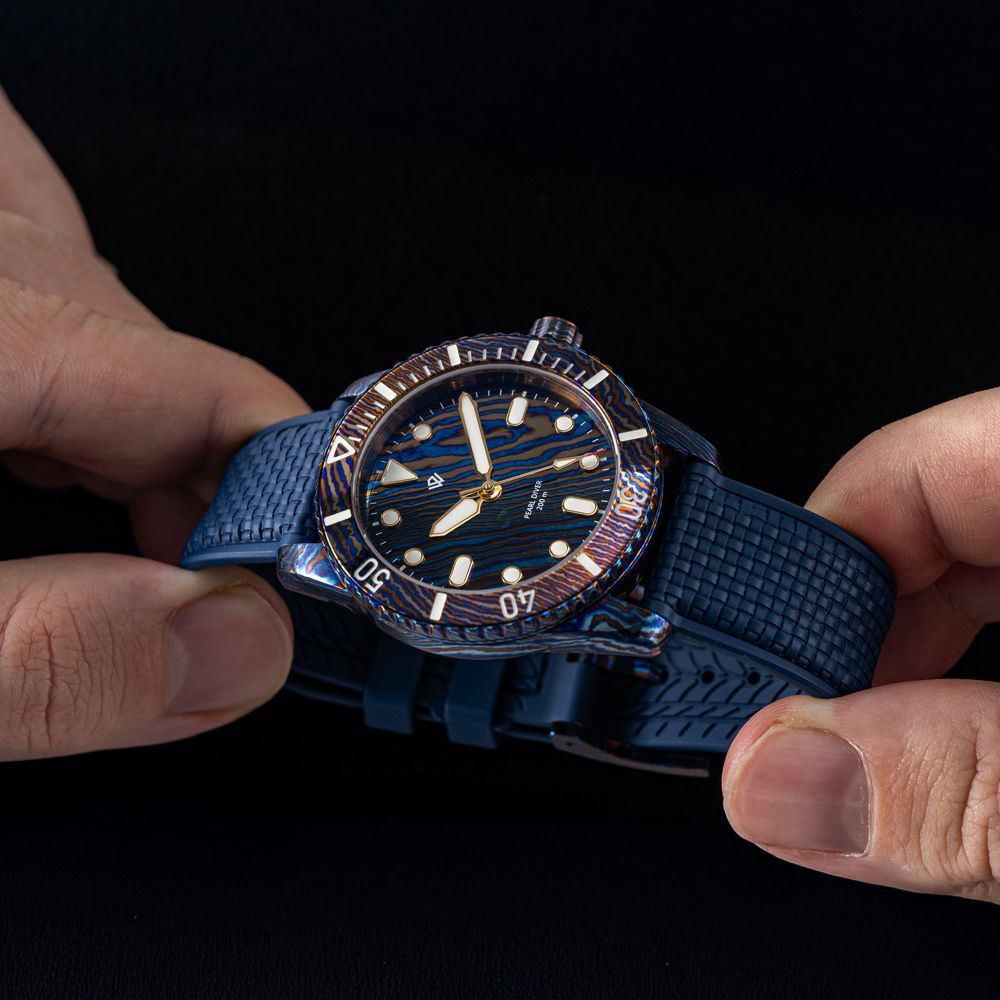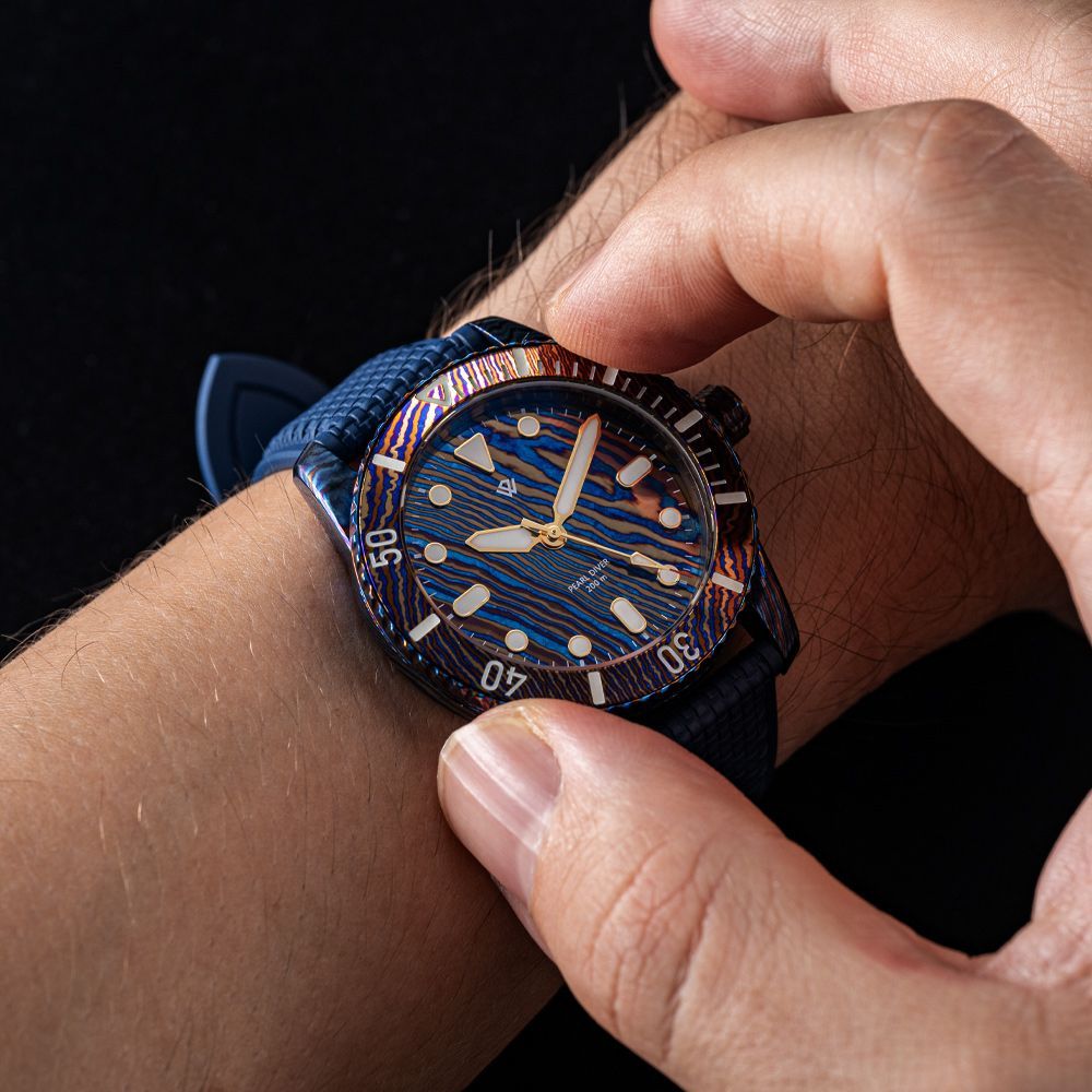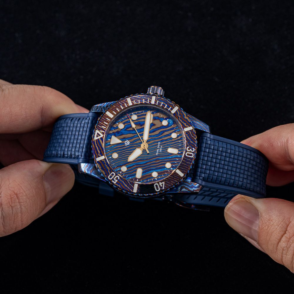 The watch's unique aesthetic is further enhanced by its Timascus bezel insert, which mirrors the stunning patterns of the case. For superior low-light visibility, the bezel's markings are filled with Nemoto lume, a high-quality Japanese luminous material known for its powerful, long-lasting glow.