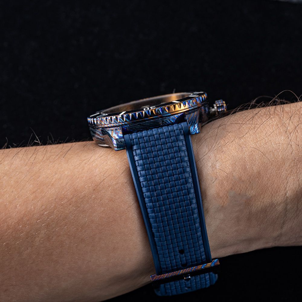 Complementing the unique Timascus case, the watch features a high-quality natural rubber strap. Its surface is adorned with a detailed mosaic-like pattern, providing a tactile and visually striking accent. The strap tapers from a 20 mm lug width down to an 18 mm buckle, which is also expertly crafted from Timascus to ensure a cohesive and luxurious feel.